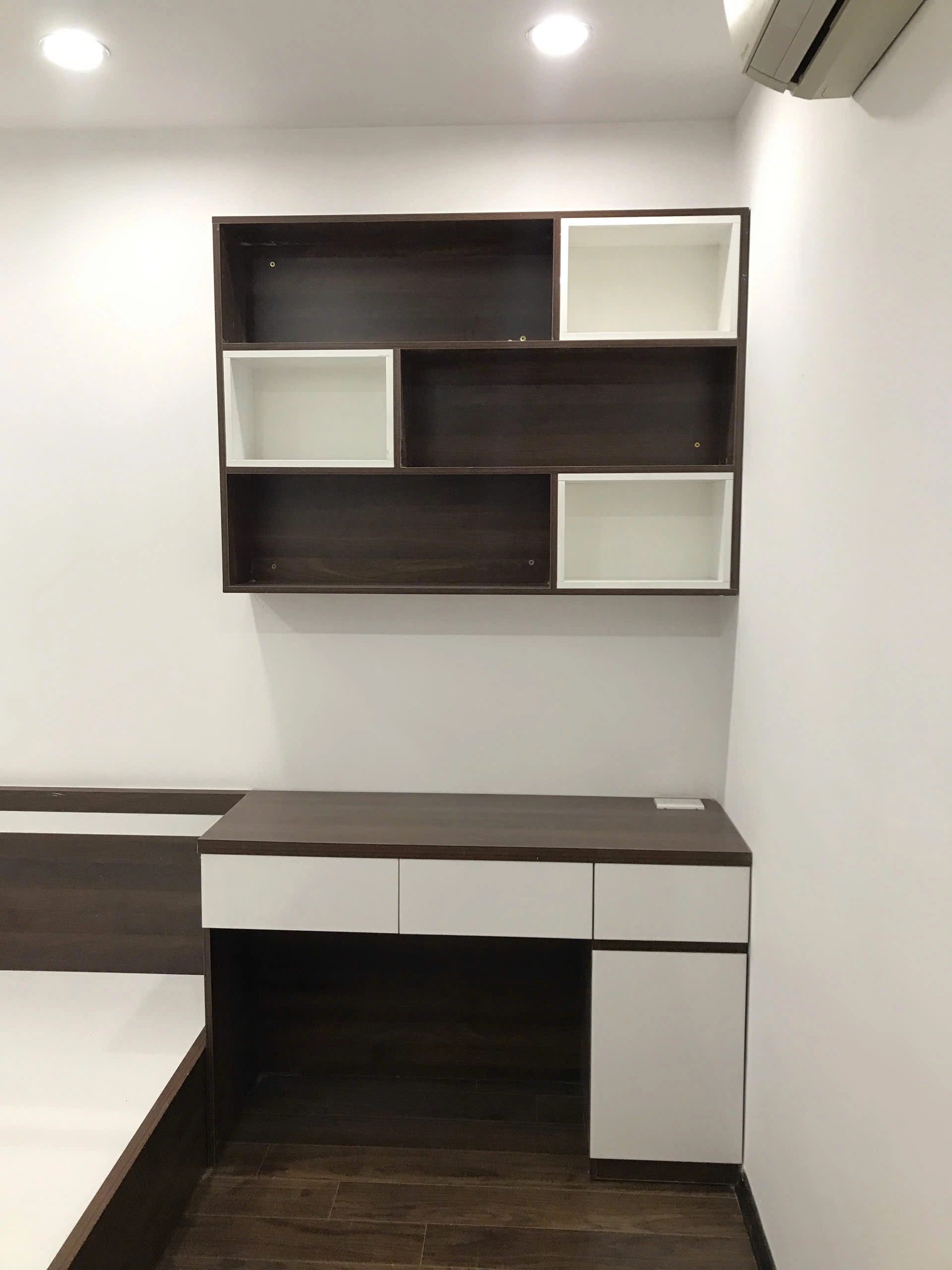 Tủ kệ treo tường thông minh: Phần kệ phía trên được chia ô vuông khoa học, giúp bạn dễ dàng sắp xếp sách, vật dụng trang trí hoặc tài liệu.