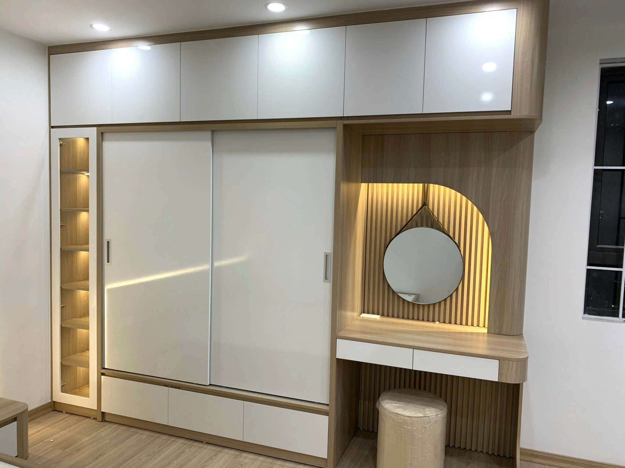 Thiết kế: Bàn trang điểm liền tủ quần áo, gương tròn dây da, đèn LED âm tường