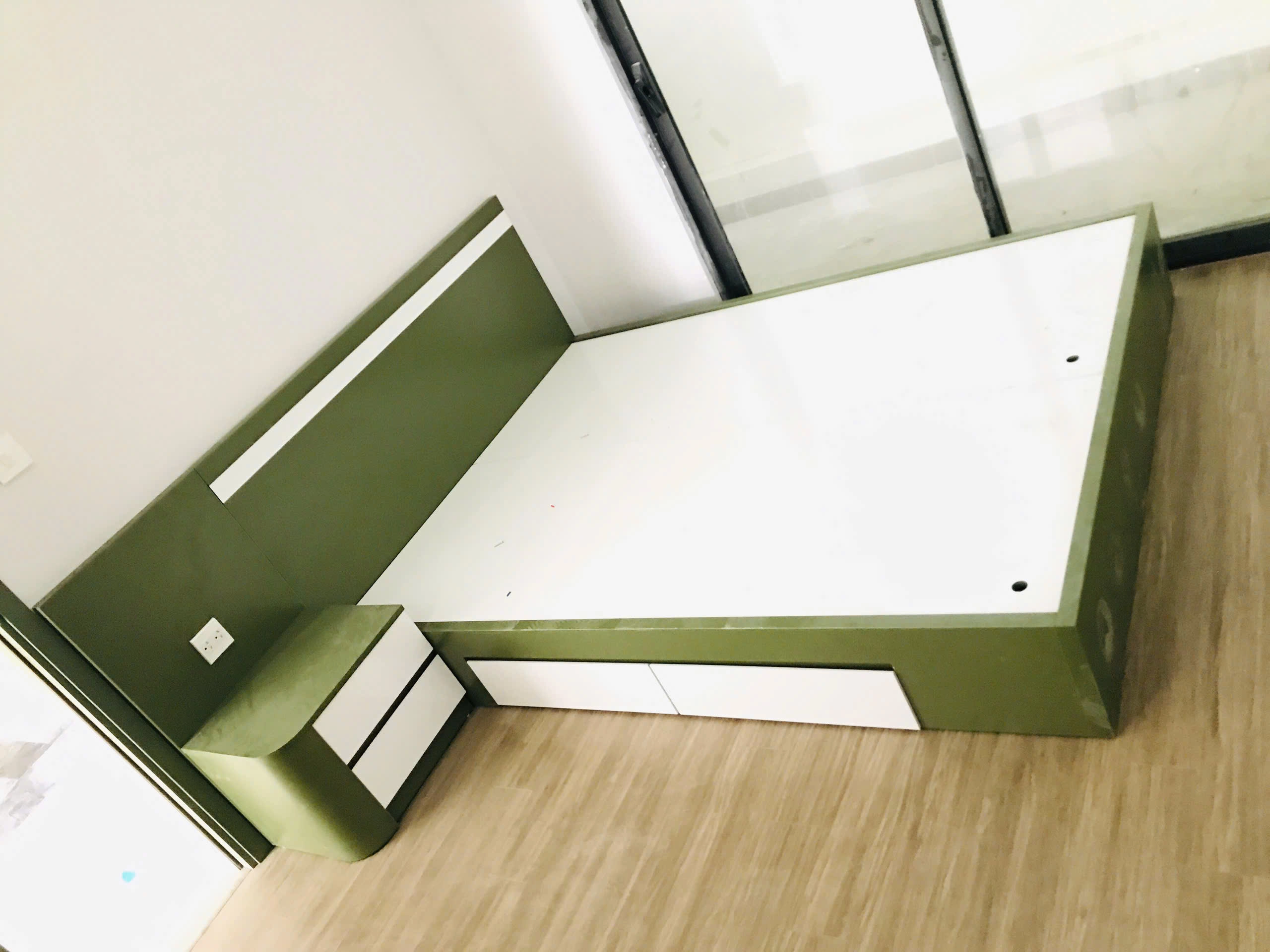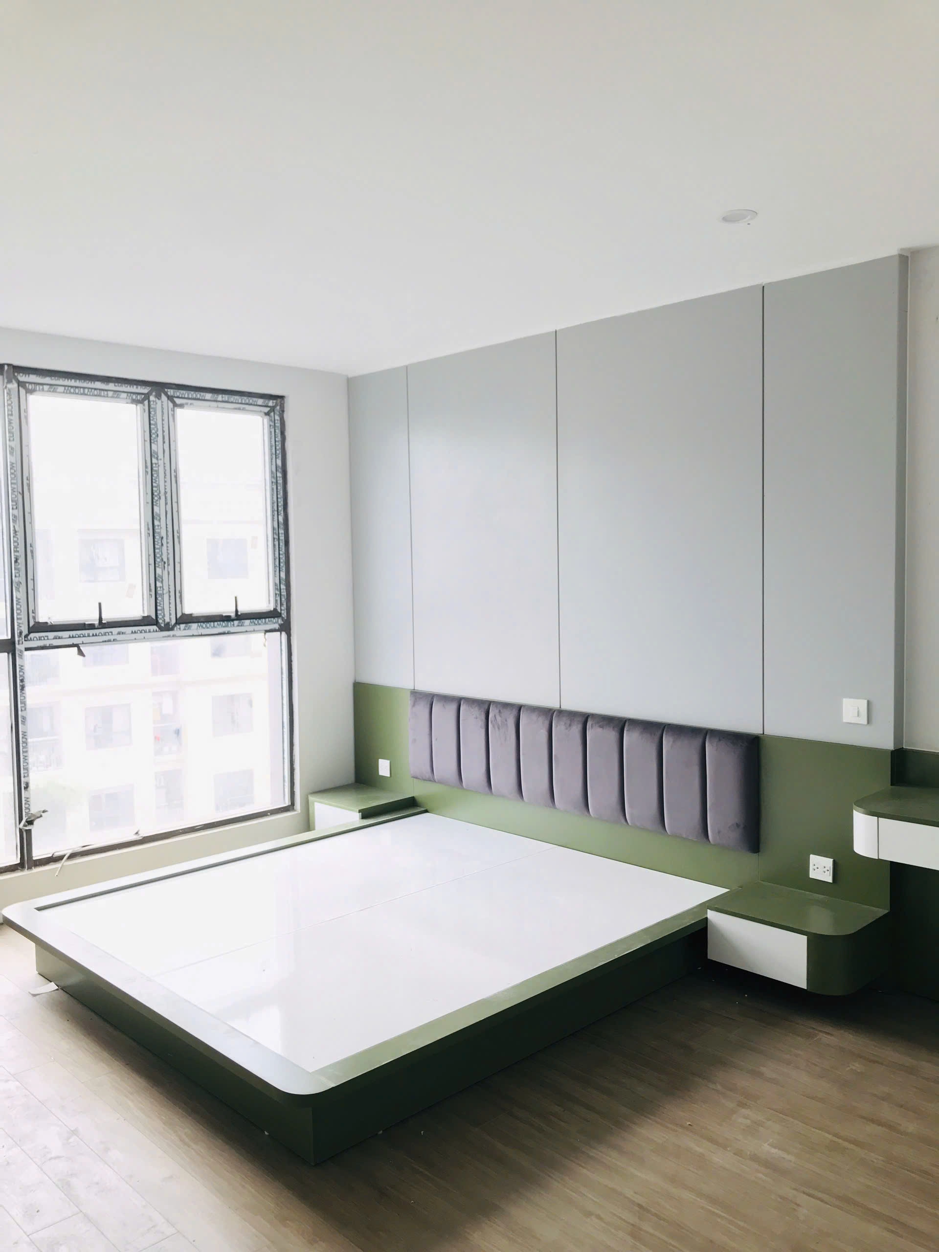 Phần thành giường bo tròn mềm mại, kết hợp tone màu xanh olive và ghi sáng giúp căn phòng trở nên hài hòa, dễ chịu và đầy cảm hứng thư giãn.