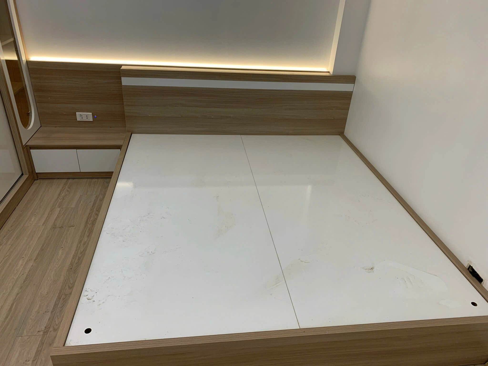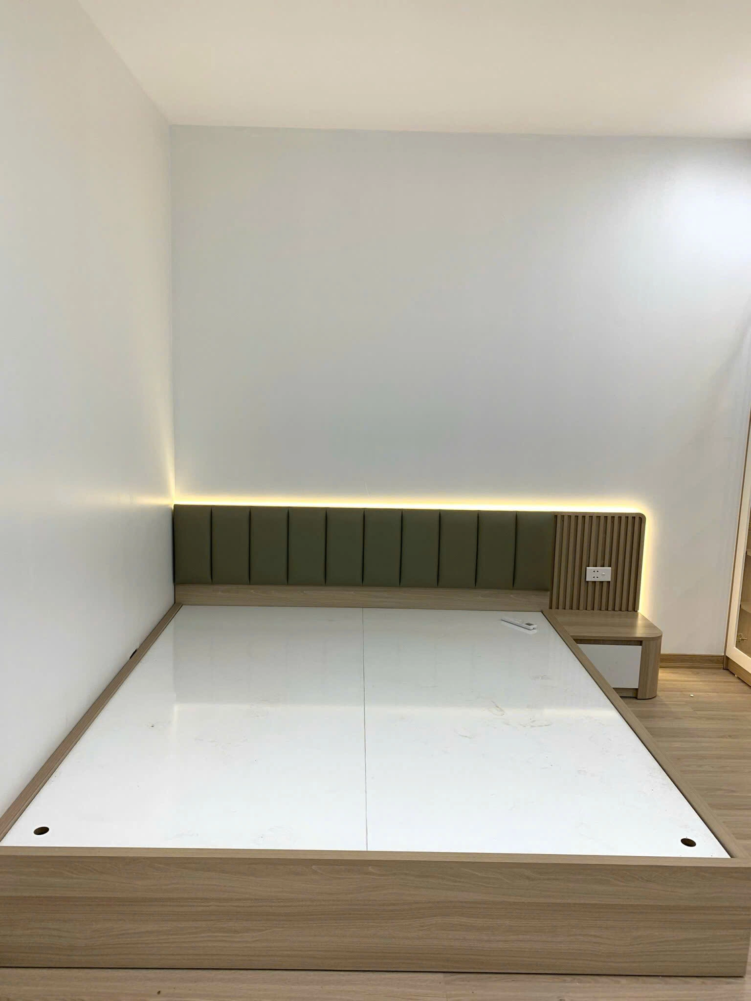 Bên cạnh là tab đầu giường liền khối, tiện lợi cho việc đặt đèn ngủ, điện thoại hay vật dụng cá nhân, đồng thời có ổ cắm điện âm tường mang lại sự tiện nghi tối đa cho người dùng.