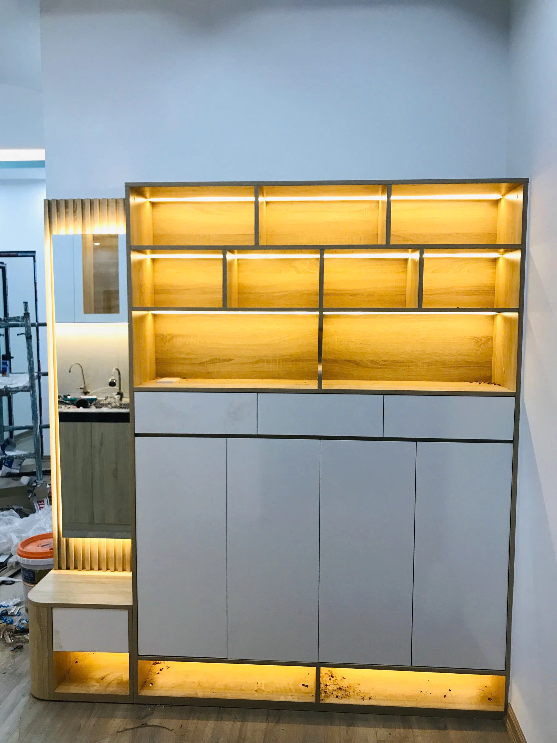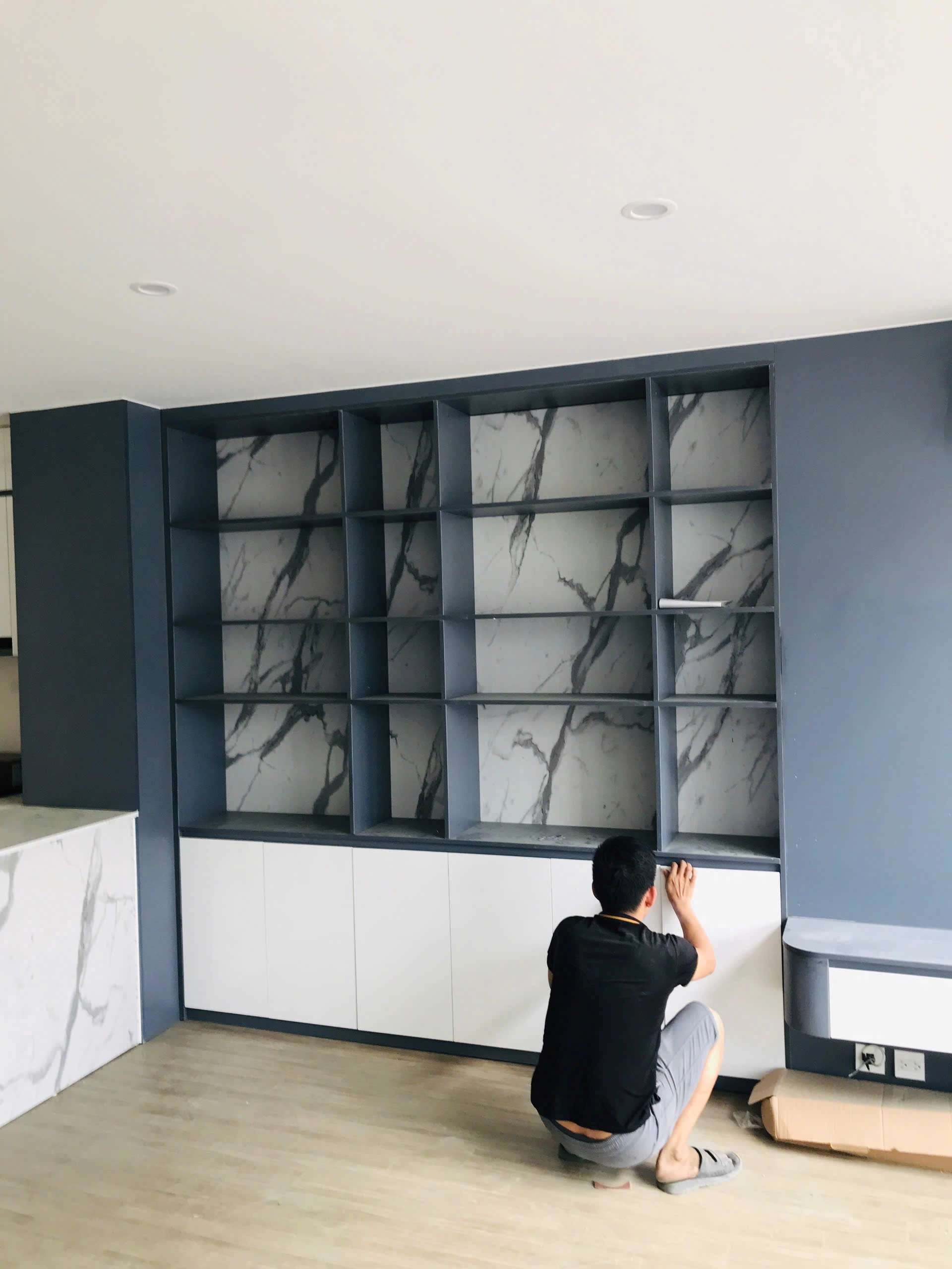 Hệ thống đèn LED âm trần tạo ánh sáng vàng dịu, làm nổi bật các ô kệ và tăng tính sang trọng cho không gian.