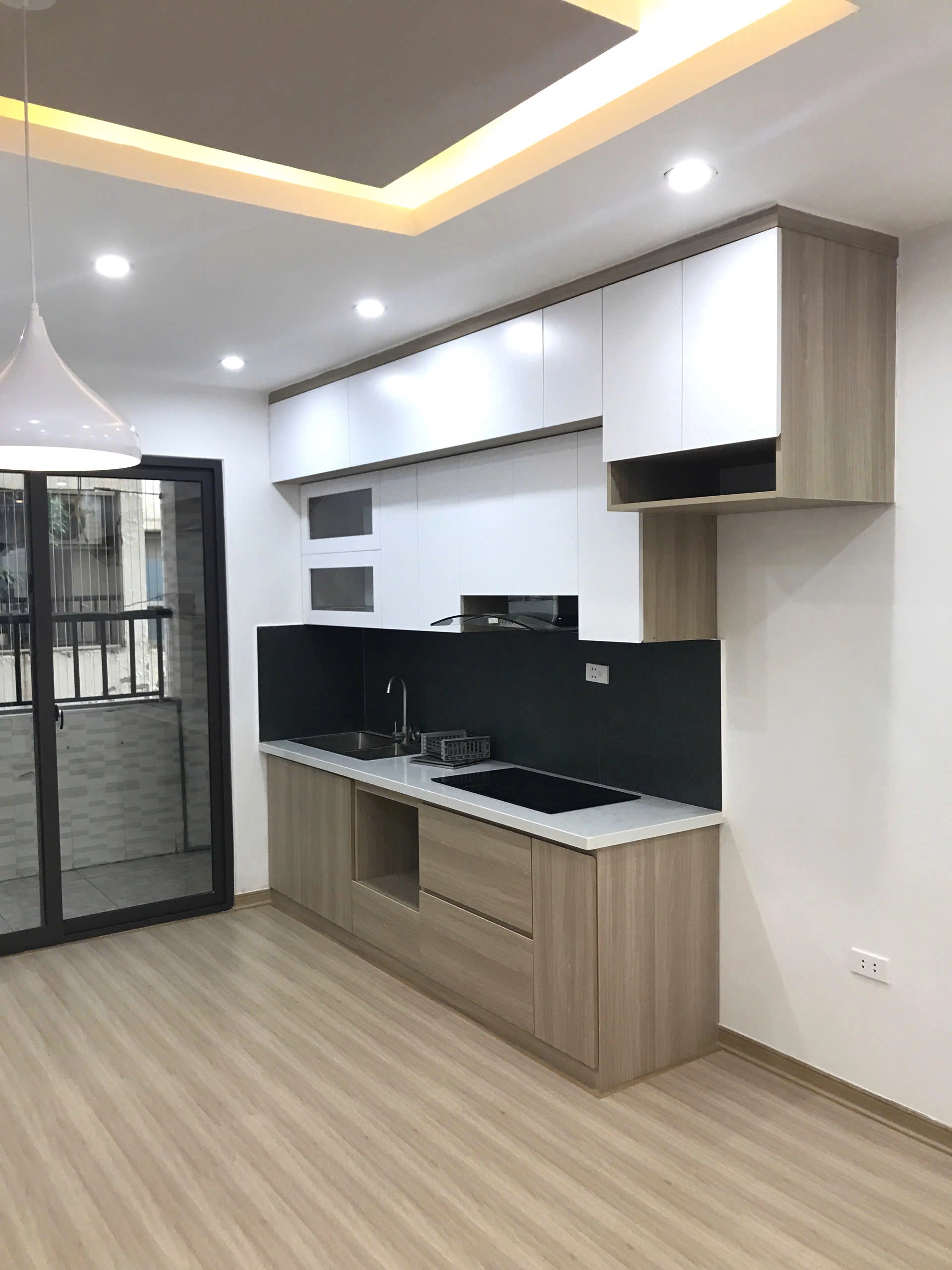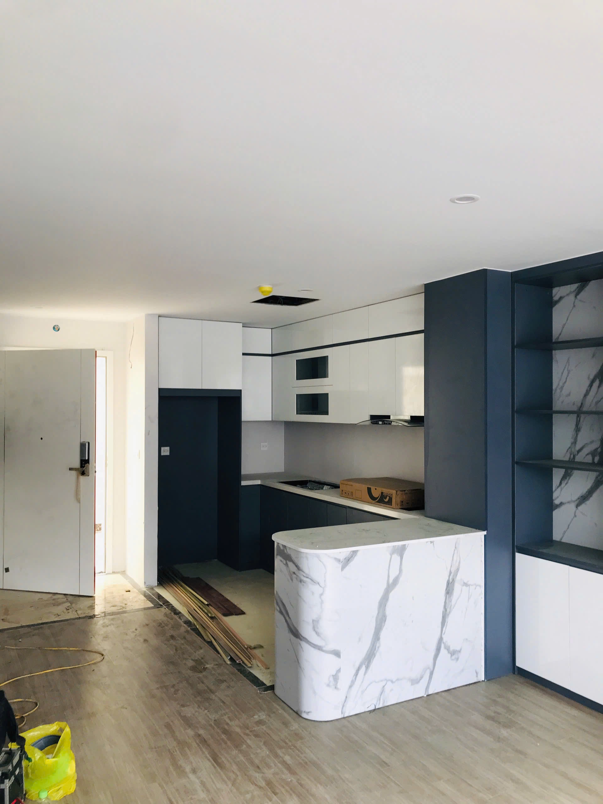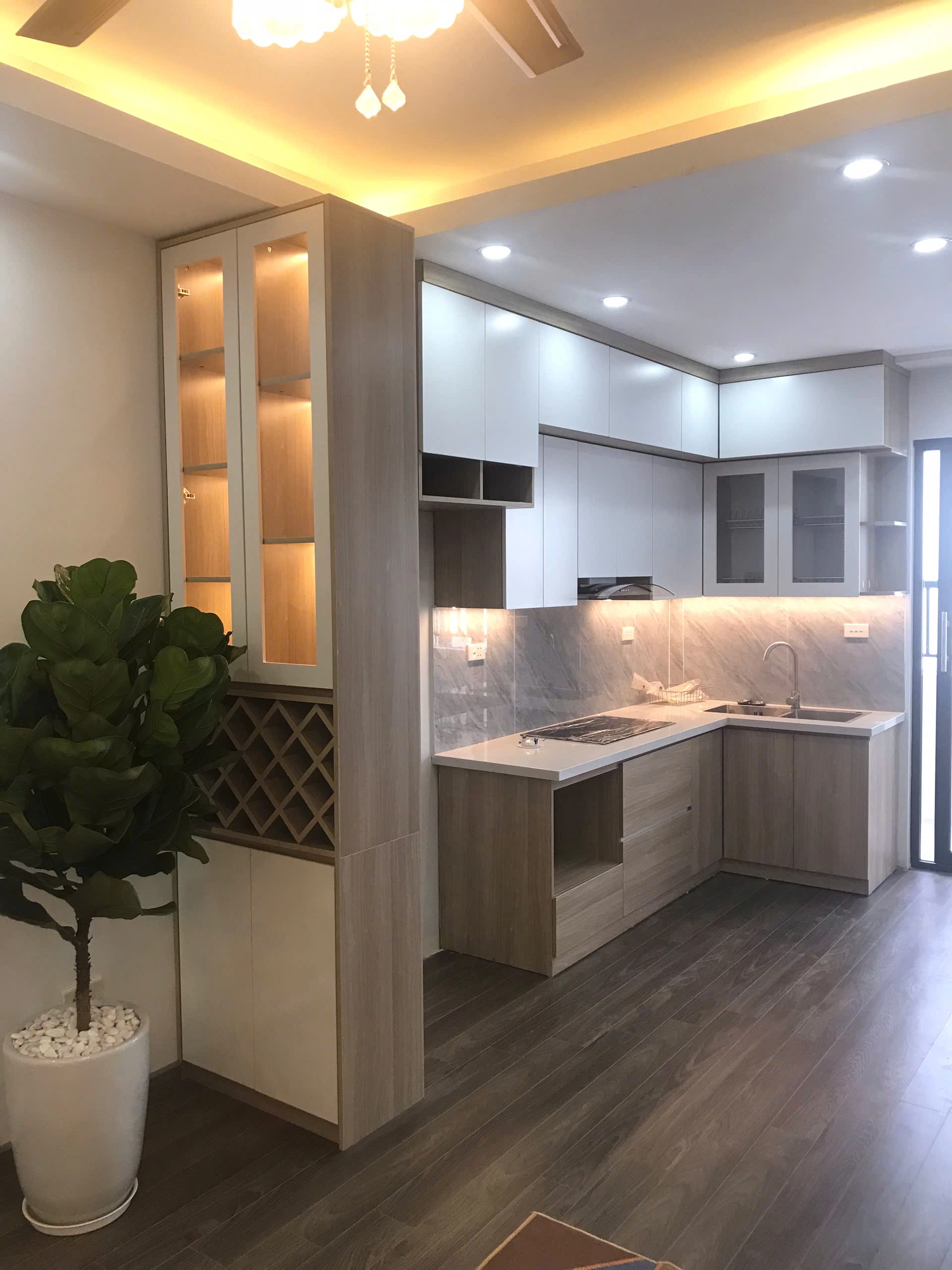 Thiết kế thông minh: Bố cục tủ bếp trên – dưới khoa học, đáp ứng đầy đủ công năng nấu nướng, lưu trữ và trang trí.