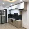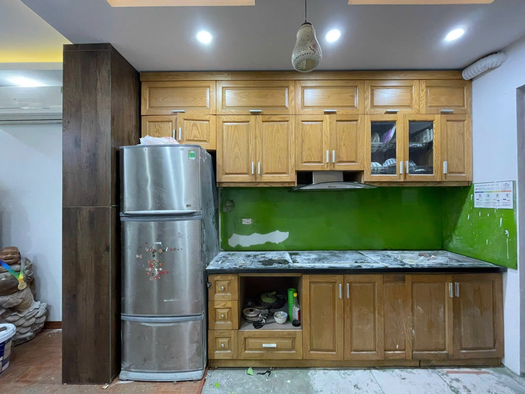 Tủ được thiết kế âm tường kèm không gian chứa tủ lạnh 2 cánh lớn, tạo sự liền mạch và gọn gàng cho tổng thể căn bếp. Mặt bếp ốp đá nhân tạo vân mây sang trọng, chịu nhiệt và chống bám bẩn tốt.