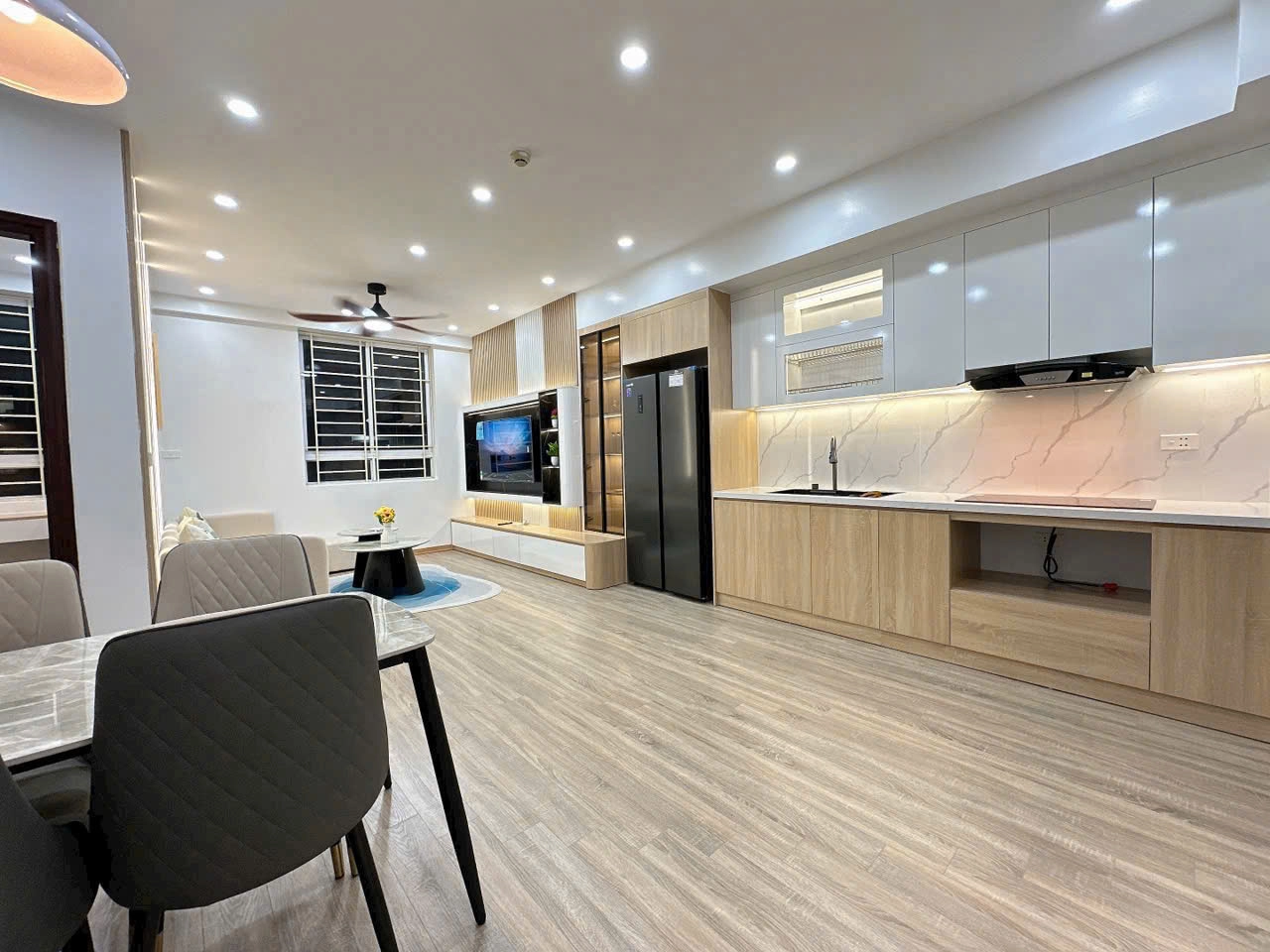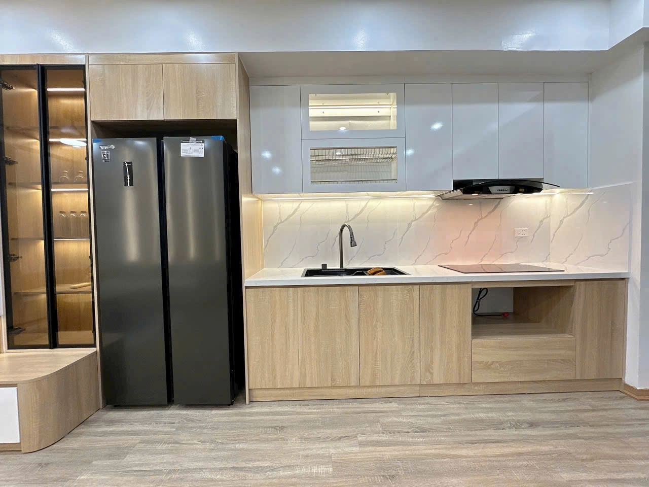 Hệ thống đèn LED âm tủ bố trí khéo léo dưới khoang treo giúp chiếu sáng khu vực bếp, vừa tăng tính thẩm mỹ vừa đảm bảo tiện nghi khi nấu nướng. Khu vực bồn rửa và bếp nấu được sắp xếp khoa học, đảm bảo phong thủy “tam giác bếp” hợp lý – giúp người nội trợ thuận tiện trong quá trình sử dụng.
