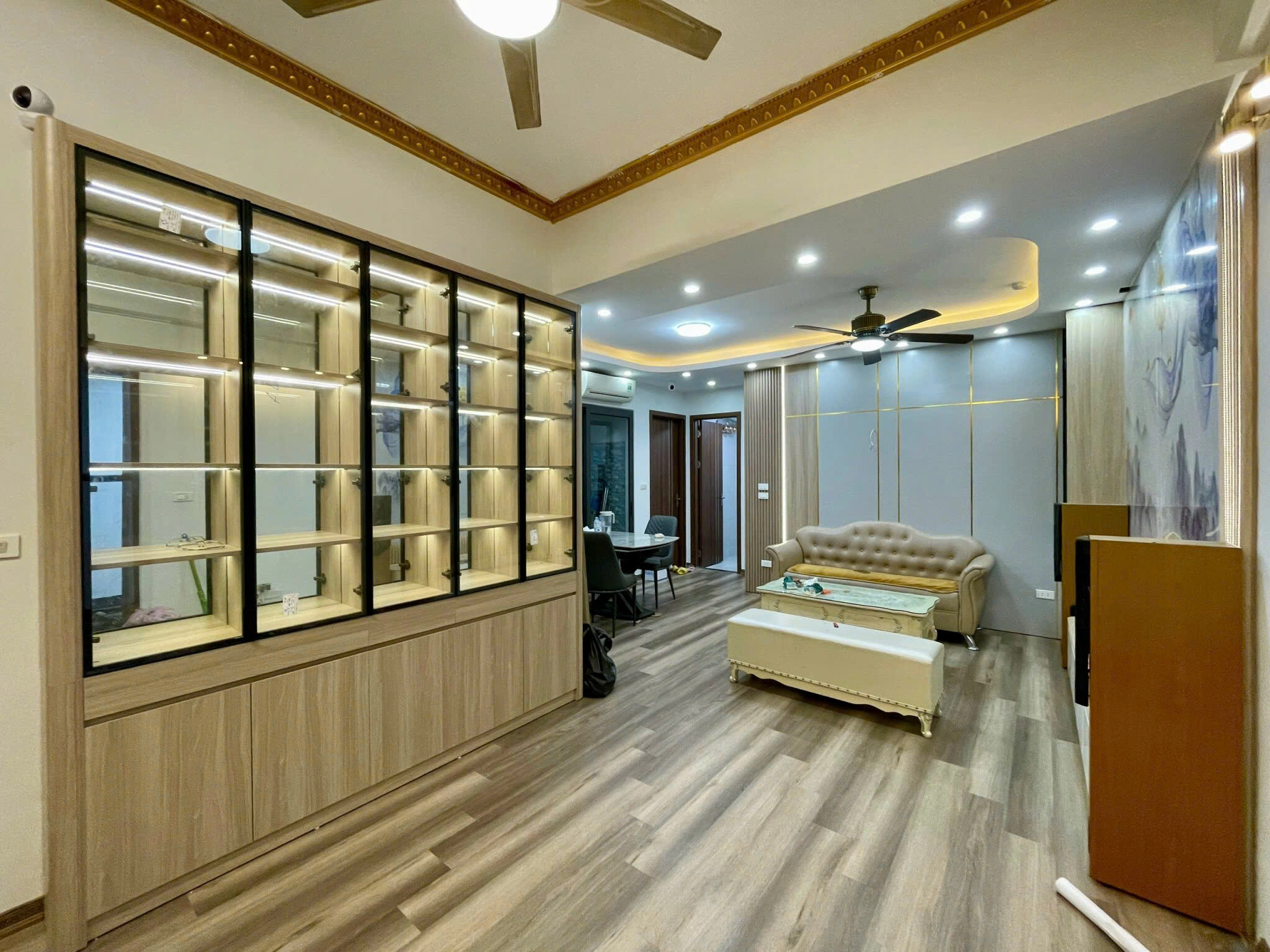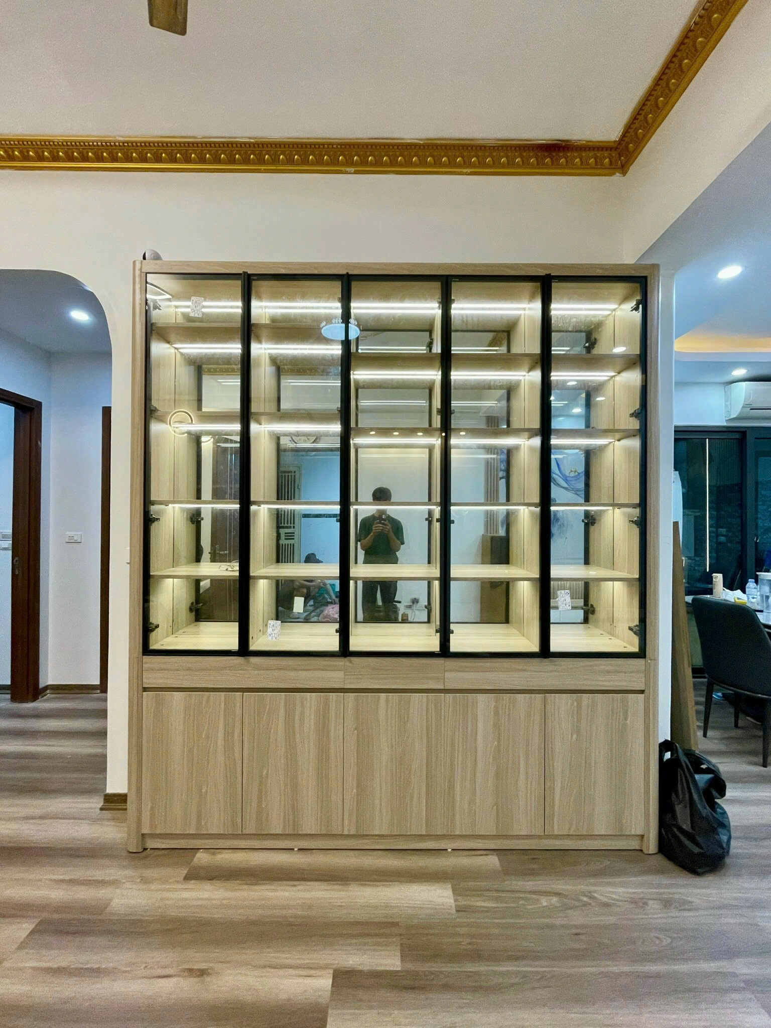 Khu vực trưng bày phía trên gồm nhiều ô kệ kính có đèn LED âm tủ, giúp tôn vinh vẻ đẹp của các món đồ decor, rượu vang, mô hình hay bộ sưu tập cao cấp. Hệ thống kính trong suốt giúp không gian trở nên nhẹ nhàng, mở rộng thị giác.