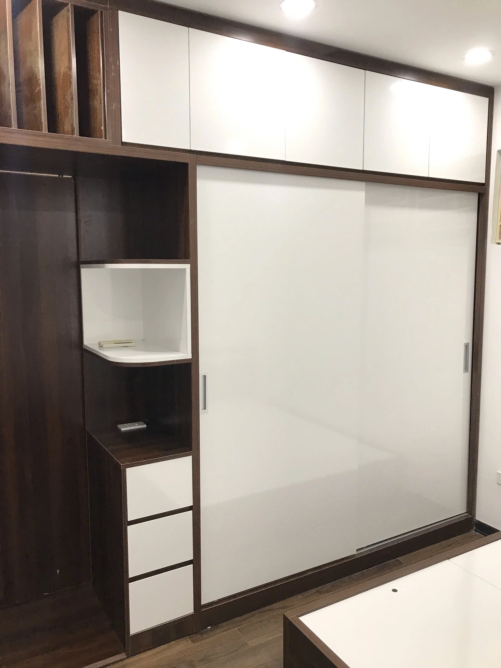 - Cánh trượt (Cửa lùa): Tủ có 2 cánh trượt lớn màu trắng, giúp tiết kiệm không gian mở cửa, rất phù hợp với phòng ngủ nhỏ hoặc vừa.